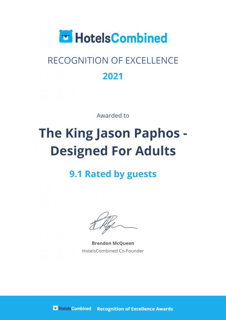 The King Jason Paphos – Σχεδιασμένο για ενήλικες, πλέον συμμετέχει σε μια ομάδα ξενοδοχείων σε όλο τον κόσμο που έχουν βραβευτεί με την Αναγνώριση Αριστείας στο HotelsCombined. Αυτή η αποκλειστική συλλογή καταλυμάτων υψηλής βαθμολογίας έχει επιλεγεί χρησιμοποιώντας ένα αυστηρό σύνολο κριτηρίων, όπως η ποιότητα και η συνέπεια των κριτικών, η απουσία επαναλαμβανόμενων ή ανεπίλυτων ζητημάτων με τους πελάτες, η δημοτικότητα του καταλύματος και, φυσικά, η συνολική βαθμολογία που προκύπτει.