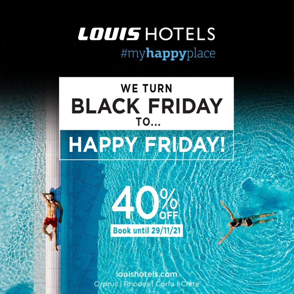 Η φετινή Black Friday γίνεται…Ηappy Friday στη Louis Hotels με τον καθένα να μπορεί να οργανώσει έγκαιρα όχι μόνο τις χειμερινές αλλά και τις ανοιξιάτικες, καλοκαιρινές και φθινοπωρινές του διακοπές από την άνεση του σπιτιού του μέσω του louishotels.com και να επωφεληθεί super έκπτωση 40%!