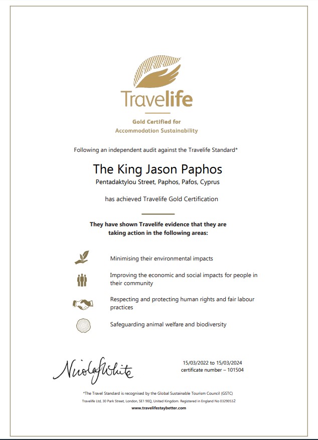 Μετά από πρόσφατο έλεγχο της Travelife, το ξενοδοχείο μας στη Πάφο The King Jason Paphos – Designed for adults , βραβεύτηκε με την πιστοποίηση Gold Travelife για το 2022. H Travelife αποτελεί μια διεθνώς αναγνωρισμένη περιβαλλοντική πιστοποίηση που διεγείρει τα ξενοδοχεία και άλλα τουριστικά καταλύματα να είναι κοινωνικά και περιβαλλοντικά βιώσιμα.