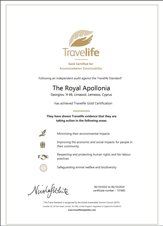Μετά από πρόσφατο έλεγχο της Travelife, το ξενοδοχείο μας στη Λεμεσό The Royal Apollonia, βραβεύτηκε με την πιστοποίηση Gold Travelife για το 2022. H Travelife αποτελεί μια διεθνώς αναγνωρισμένη περιβαλλοντική πιστοποίηση που διεγείρει τα ξενοδοχεία και άλλα τουριστικά καταλύματα να είναι κοινωνικά και περιβαλλοντικά βιώσιμα.