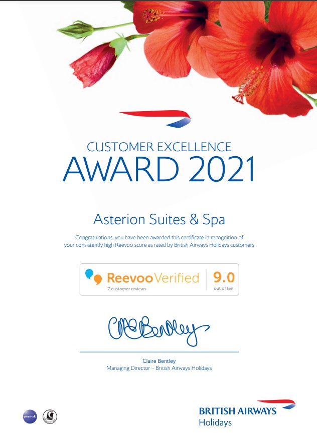 Our new hotel in Chania, Crete Asterion Suites & Spa is delighted to announce that it has received a British Airways Customer Excellence Award! This award comes from unbiased customer reviews and is designed to showcase the hotels that make their guests the happiest. Asterion Suites & Spa received an overall score of 9/10!