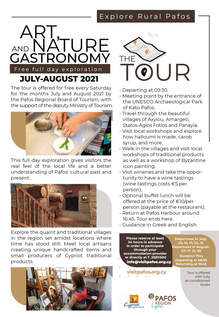 Enjoy free full day exploration of Paphos Area. The tour is offered every Saturday during July & August 2021 by the Pafos regional board of tourism., with the support of the deputy ministry of Tourism.