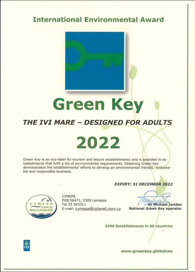 We are pleased to announce that our hotel in Paphos, The Ivi Mare has achieved the Green Key International Environmental Award for 2022.