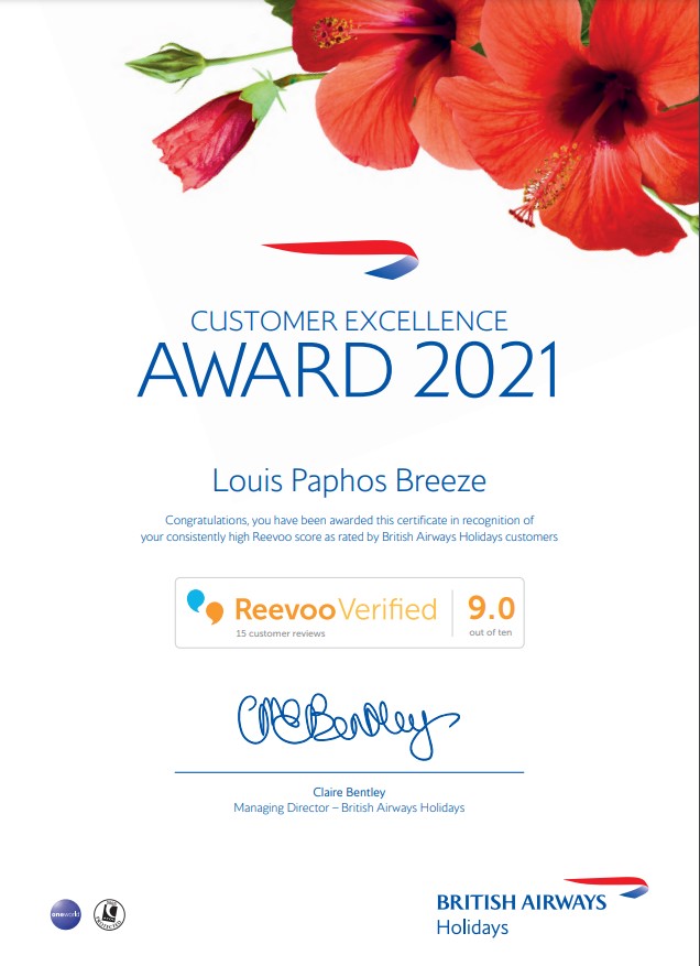 Our all-inclusive hotel in Paphos, Cyprus Louis Paphos Breeze is delighted to announce that it has received a British Airways Customer Excellence Award! This award comes from unbiased customer reviews and is designed to showcase the hotels that make their guests the happiest. Louis Paphos Breeze received an overall score of 9/10!