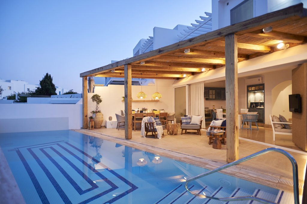 The villa has a private pool with a waterfall, as well as a roof garden with an outdoor jacuzzi and outdoor furnishings. It also has a barbecue, sunbeds, and umbrellas to accommodate those who want to enjoy their holidays just like they would at their home. The villa also has lots of space to simply relax and enjoy the Cyprus sun. The property combines sophistication and pleasant aesthetics by utilising an elegant yet contemporary style. Chris Le Mare Gold visitors have access to the complimentary facilities at Louis St Elias Resort & Waterpark, which include waterslides, an outdoor jacuzzi (for adults), a kids pool, an outdoor pool, a kids club, and a gym.